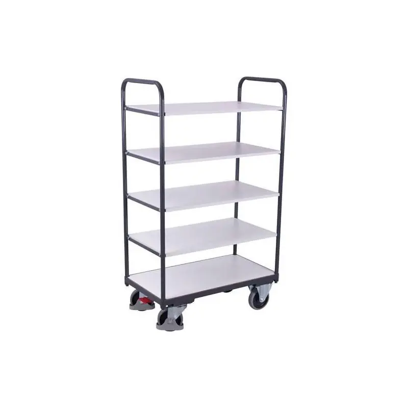 Přepravní vozík ESD -Modulární systém - Elektricky vodivé provedení (ESD = elektrostatický výboj). Konstrukce podlahy z L-profilu. Zátěžový povrch z elektricky vodivé dekorativní dřevotřísky (světle šedá). Police jsou vyrobeny z úhlové oceli. Police jsou zavěšené, odnímatelné a lze je použít různými způsoby. -Prášková barva RAL 7024 grafitově šedá, elektricky vodivá. Povrch je odolný proti nárazu a poškrábání. -Kola "neznačková Pneumatiky z šedé elektricky vodivé plné pryže na plastových ráfcích s přesnými kuličkovými ložisky s hlubokými drážkami, ochranou závitů a patek. 2 otočná kolečka se systémem EasySTOP a 2 pevná kolečka. ESD policový vozík - vysoký