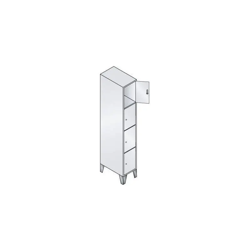 Skříňka s plastovými nožičkami, výška 150 mm (celková výška 1850 mm). - Mnoho přihrádek v nejmenším prostoru Se 4 přihrádkami s 1, 2, 3 nebo 4 přihrádkami vedle sebe. - Robustní ocelová konstrukce s vysoce kvalitní vypalovanou povrchovou úpravou. Zvýšená ochrana proti korozi díky plastovým nožičkám skříně. - Uzamykatelné dveře Uzamčeno cylindrickými zámky, každý se 2 klíči. Kloub vpravo. Jednostěnný model s hladkým povrchem bez perforace a rámečku na štítky. - Design Nohy: výška 150 mm, pro barvu karoserie RAL 7035 ve světle šedé barvě, jinak černá.