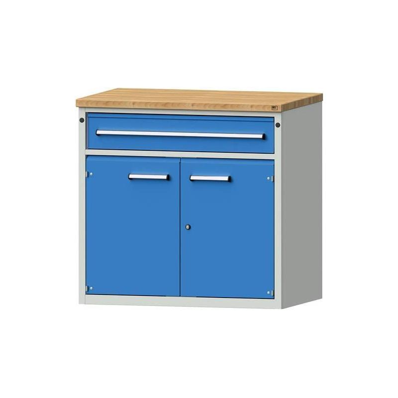 Pultová skříňka model 3022 - Standardní lakování Karoserie: světle šedá RAL 7035. Čela zásuvek/dveří RAL 5012 světle modrá. Další barvy najdete v nabídce barev bez příplatku. Skříňka s protiskluzovou podložkou. Pultová skříňka s deskou z bukového masivu ANKE. Lze ideálně kombinovat s pracovními stoly. Pultová klapka a křídlové dveře na vyžádání! - Dokončení: S masivní bukovou deskou. Šířka skříně: 1060 mm. Hloubka: 675 mm. Výška po horní okraj: 1020 mm. Hmotnost: přibližně 91 kg.