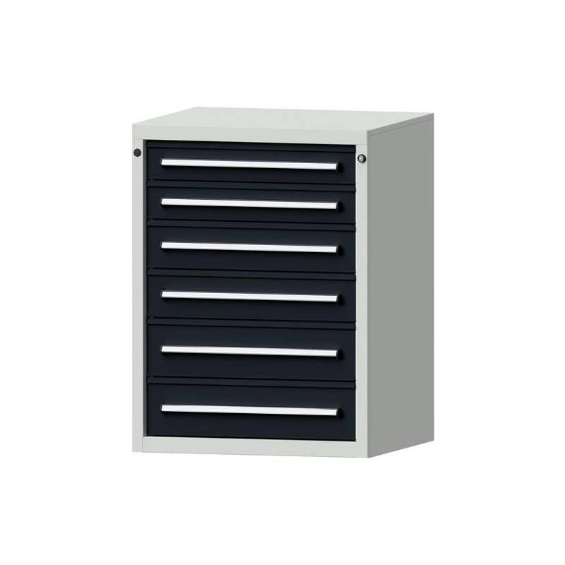 Šuplíková skříň 760x675x1000 mm, RAL 7035/7016 - Vysoce kvalitní konstrukce z kvalitního plechu. Maximální zatížení skříně 1000 kg, při rovnoměrném zatížení povrchu. - Zásuvky se 100 % plným výsuvem Individuální výsuvná zarážka. Nosnost zásuvky 75 kg. Vnitřní rozměry Š 600xH 600 mm. S perforovanou policí s mřížkou 25 mm a reliéfními bočnicemi pro rozdělení zásuvek. Vysoce kvalitní hliníková rukojeť s popisovacím proužkem. - Centrální zamykání s výměnnou vložkou DOM® Lze integrovat do uzamykacího systému DOM® výměnou uzamykacího jádra. - Dvoubarevné práškové lakování