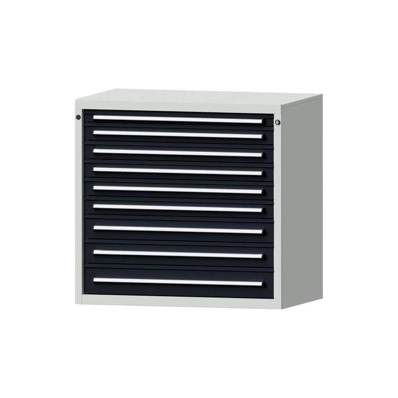 Šuplíková skříň 1060x675x1000 mm, RAL 7035/7016 - Vysoce kvalitní konstrukce z kvalitního plechu. Maximální zatížení skříně 1000 kg, při rovnoměrném zatížení povrchu. - Zásuvky se 100 % plným výsuvem Individuální výsuvná zarážka. Nosnost zásuvky 75 kg. Vnitřní rozměry Š 900 x D 600 mm. S perforovanou policí s mřížkou 25 mm a reliéfními bočnicemi pro rozdělení zásuvek. Vysoce kvalitní hliníková rukojeť s popisovacím proužkem. - Centrální zamykání s výměnnou vložkou DOM® Lze integrovat do uzamykacího systému DOM® výměnou uzamykacího jádra. - Dvoubarevné práškové lakování