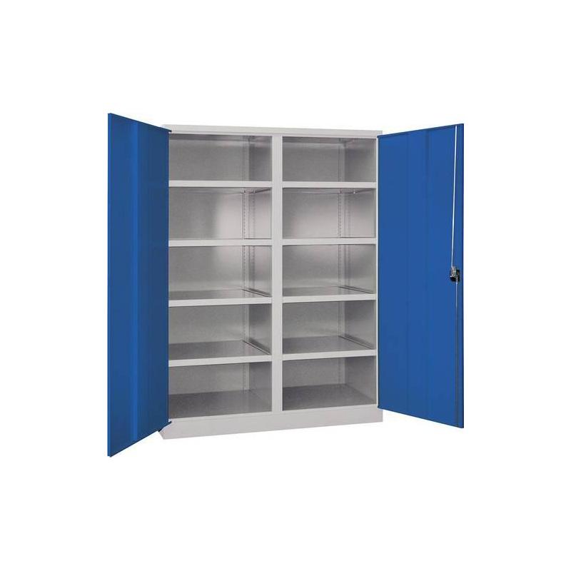 Velkokapacitní skříň pro velké zatížení, spodní zatížení 120 kg - Nosnost skříně 1300 kg Pevná svařovaná konstrukce z ocelového plechu. Nosnost podlahy 120 kg při rovnoměrně rozloženém zatížení. - Práškově lakované police Nosnost na jednu polici 120 kg. Nastavitelná výška v krocích po 25 mm. - Dveře s výztužnými kapsami. Úhel otevření dveří 180°. - Bezpečnost a zabezpečení Otočná rukojeť s tříbodovým zamykáním a integrovaným zámkem vložky. - Vysoce kvalitní práškové lakování