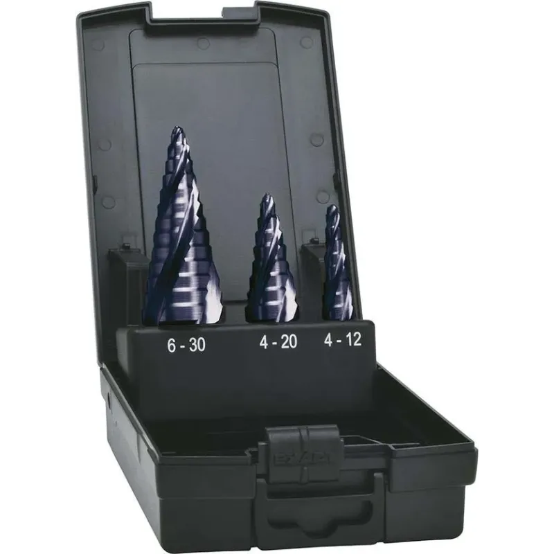 Provedení: Inovativní stupnovitý vrták se 4 brity, INOVATIVNÍ 4-BRITÁ SPIRÁLOVÁ DRÁŽKA, NOVÁ TURBO ŠPICKA výrazne usnadnuje centrování a vrtání. Díky 3-hranému dríku se zabrání prokluzu ve sklícidle. Laserské znacení prumeru otvoru a otácek. I pri otácivém nástroji lze prumer otvoru snadno odecíst.