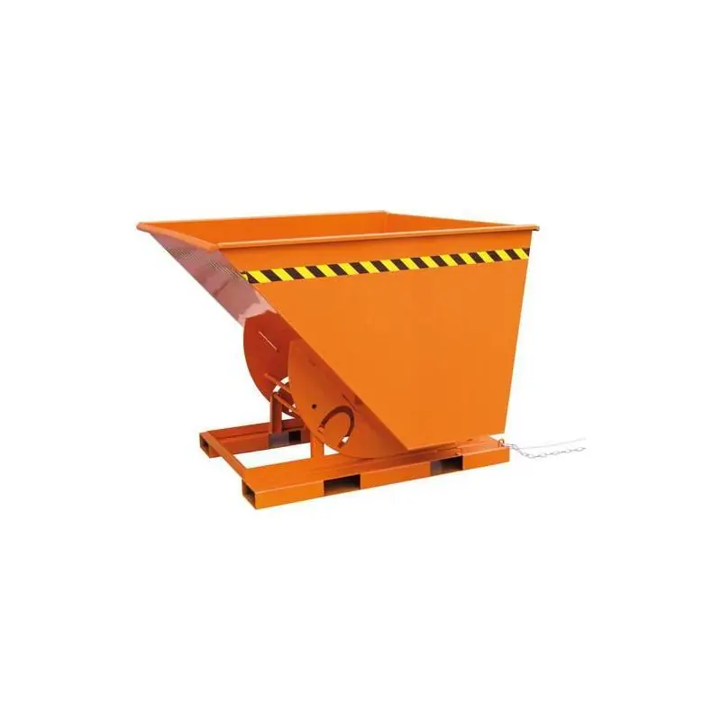 Vyklopný kontejner na kolečkách, RAL 2004 - Vysoká světlá výška Lze je vyklápět/vyprazdňovat příčně a ve směru jízdy. - Pohodlné samonavíjení Odemykání kabelem ze sedadla řidiče. S pojistkou řetězu proti nechtěnému sklouznutí z prstů. Lze jej naklonit do libovolné výšky pomocí táhla. - Snadné ovládání vysokozdvižného vozíku Sklápěcí kontejner na kolečkách s jemným vyklápěním chrání materiál.