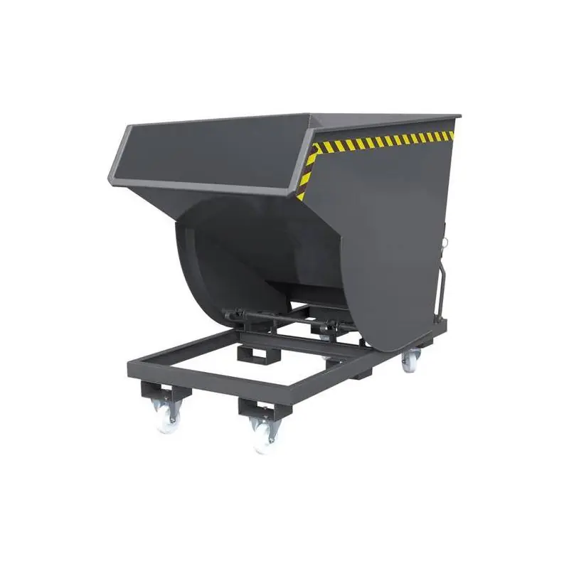 Vyklopný kontejner s válečky, RAL 7016 - Nízká celková výška Ideální pro použití jako pomocná nádoba na strojích. - Perfektní úhel vyklápění, samonavíječ Úplné vyprázdnění beze zbytků. Odemykání kabelem ze sedadla řidiče. - Snadná montáž Speciální profily na spodní vyklápěcí hraně pro snadné postavení do ložné polohy.