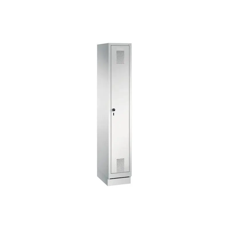 Šatní skříňka s podstavcem řady Evolo, světle šedá/světle šedá -Konstrukce z ocelového plechu s dlouhou životností. S vysokou stabilitou pro snadné a pohodlné vyjmutí oděvů. Zvýšená odolnost proti vloupání díky extrémně odolným dveřím v karoserii proti zkroucení. -Dveře se zarážkou Pravotočivý, uložený v otočných čepu, se snadno čistitelnou perforací. vzor otvorů a reliéfní rámeček štítku pro integrovatelné číslování. S bezpečnostním otočným šroubovým zámkem pro visací zámky. -Promyšlený koncept interiéru Police na klobouky s ochranou proti srolování. Tyč na oděvy z oválného profilu, 3 háčky s neotáčivým háčkem a systémovou nádobou. pro věšáky nebo posuvné příčky. Snadno čistitelná, hladce zametatelná podlaha oddílu. -EBL (koncept větrání Evolo) Účinné větrání a vysoušení interiéru díky optimální cirkulaci vzduchu. -S podstavcem Podstavec skříně: částečně pozinkovaný, potažený v barvě skříně. K dispozici je také odpovídající příslušenství. Zeptejte se Sii!