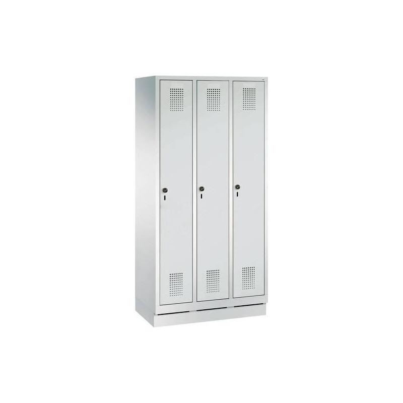 Šatní skříňka s podstavcem řady Evolo, světle šedá/světle šedá -Konstrukce z ocelového plechu s dlouhou životností. S vysokou stabilitou pro snadné a pohodlné vyjmutí oděvů. Zvýšená odolnost proti vloupání díky extrémně odolným dveřím v karoserii proti zkroucení. -Dveře se zarážkou Pravotočivý, uložený v otočných čepu, se snadno čistitelnou perforací. vzor otvorů a reliéfní rámeček štítku pro integrovatelné číslování. S bezpečnostním otočným šroubovým zámkem pro visací zámky. -Promyšlený koncept interiéru Police na klobouky s ochranou proti srolování. Tyč na oděvy z oválného profilu, 3 háčky s neotáčivým háčkem a systémovou nádobou. pro věšáky nebo posuvné příčky. Snadno čistitelná, hladce zametatelná podlaha oddílu. -EBL (koncept větrání Evolo) Účinné větrání a vysoušení interiéru díky optimální cirkulaci vzduchu. -S podstavcem Podstavec skříně: částečně pozinkovaný, potažený v barvě skříně. K dispozici je také odpovídající příslušenství. Zeptejte se Sii!